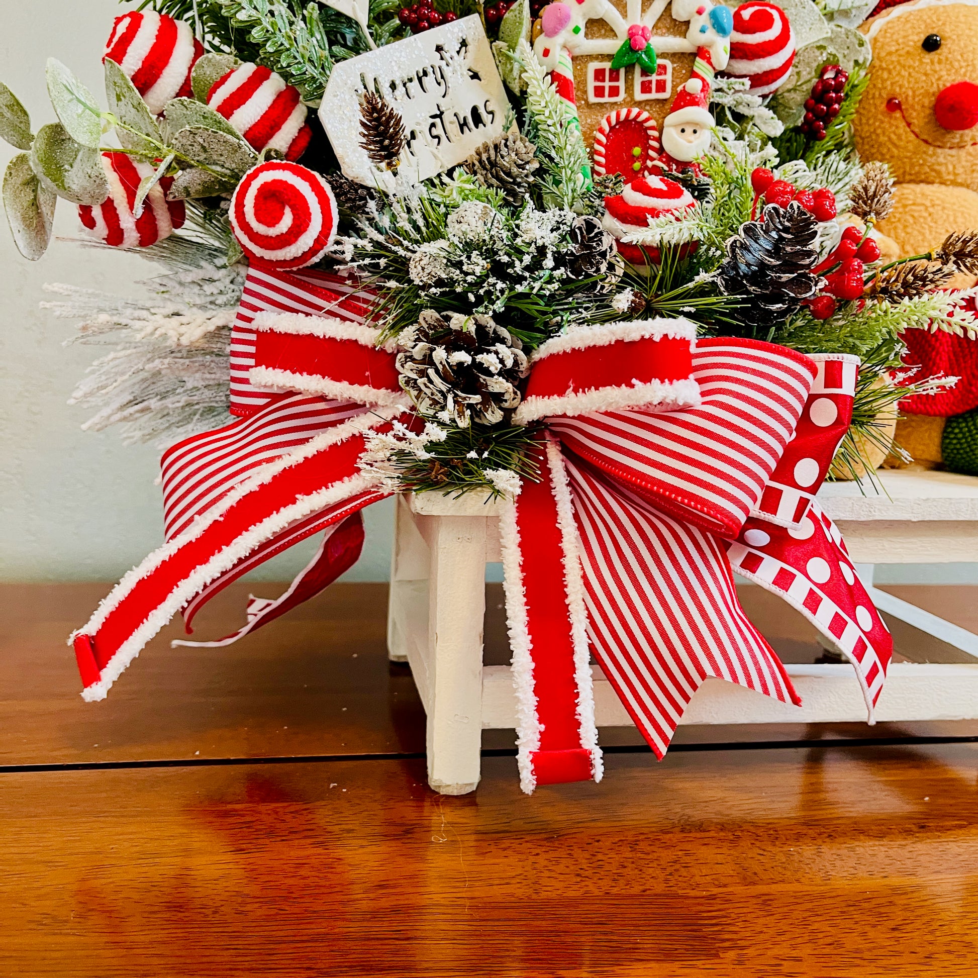 Sweet as a cookie tray and ready to display! This full gingerbread centerpiece layers snowy evergreens, peppermint lollipops, pinecones, berries, a gingerbread girl, and a cookie house—finished with a festive stacked red-and-white bow. Perfect for a kitchen island, dining table, coffee bar, or entry chest.