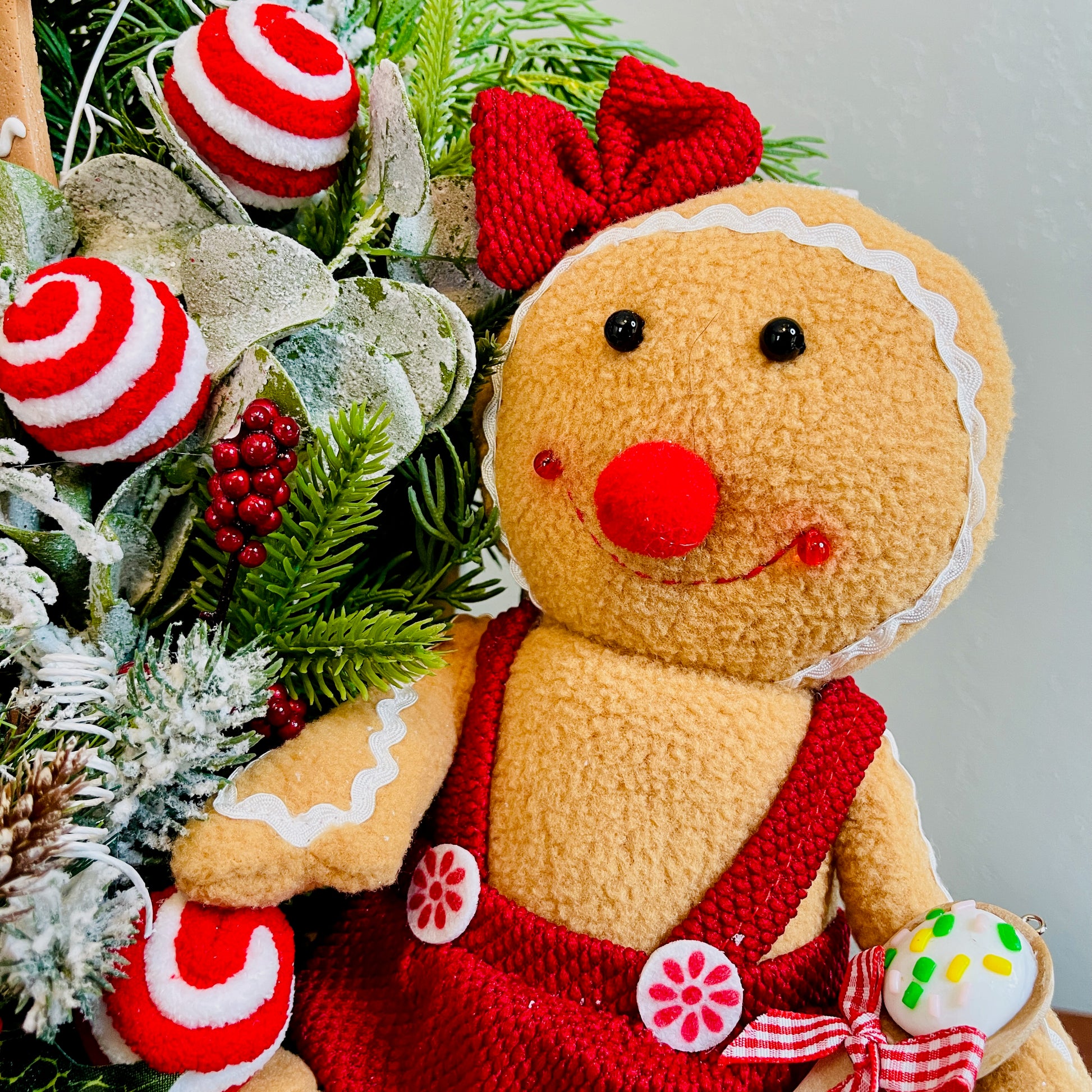 Gingerbread & Peppermint Christmas Centerpiece — Gingerbread Girl, Cookie House, Red-White Bow (Kitchen Table or Entry)