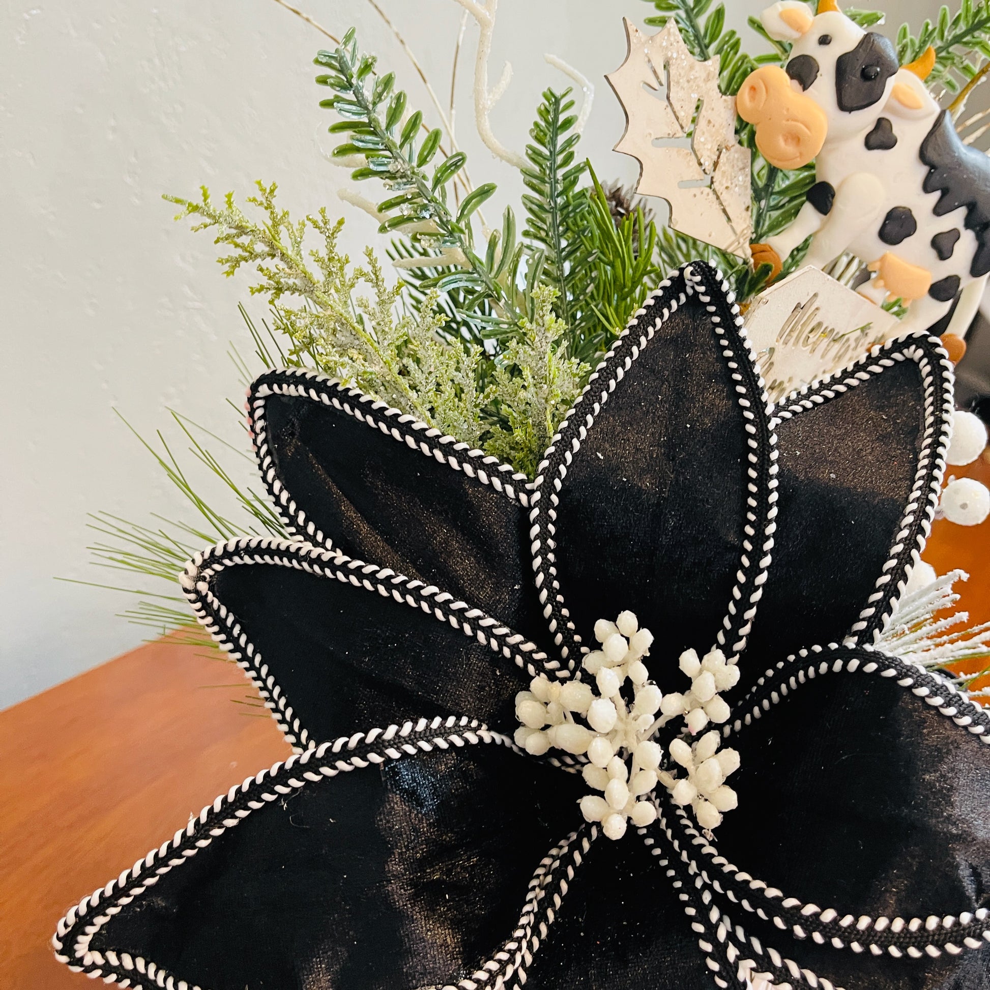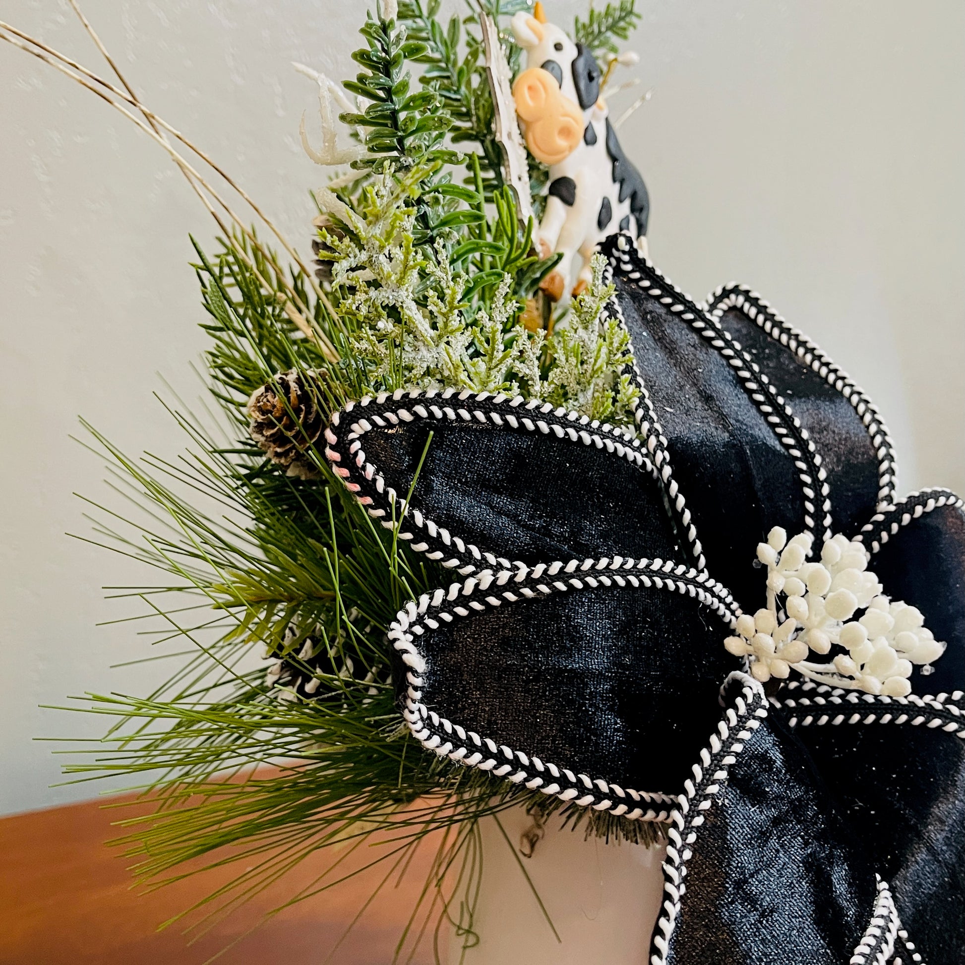 Bring a little farmhouse cheer to the holidays! This cow “MOO” coffee mug is filled with winter greens, snowy berries, frosted pine, a Merry Christmas accent, and a chic black-and-white ribbon bow. The cow ornament lifts out—no glue on the mug—so it’s gift-ready now and cocoa-ready later. Details