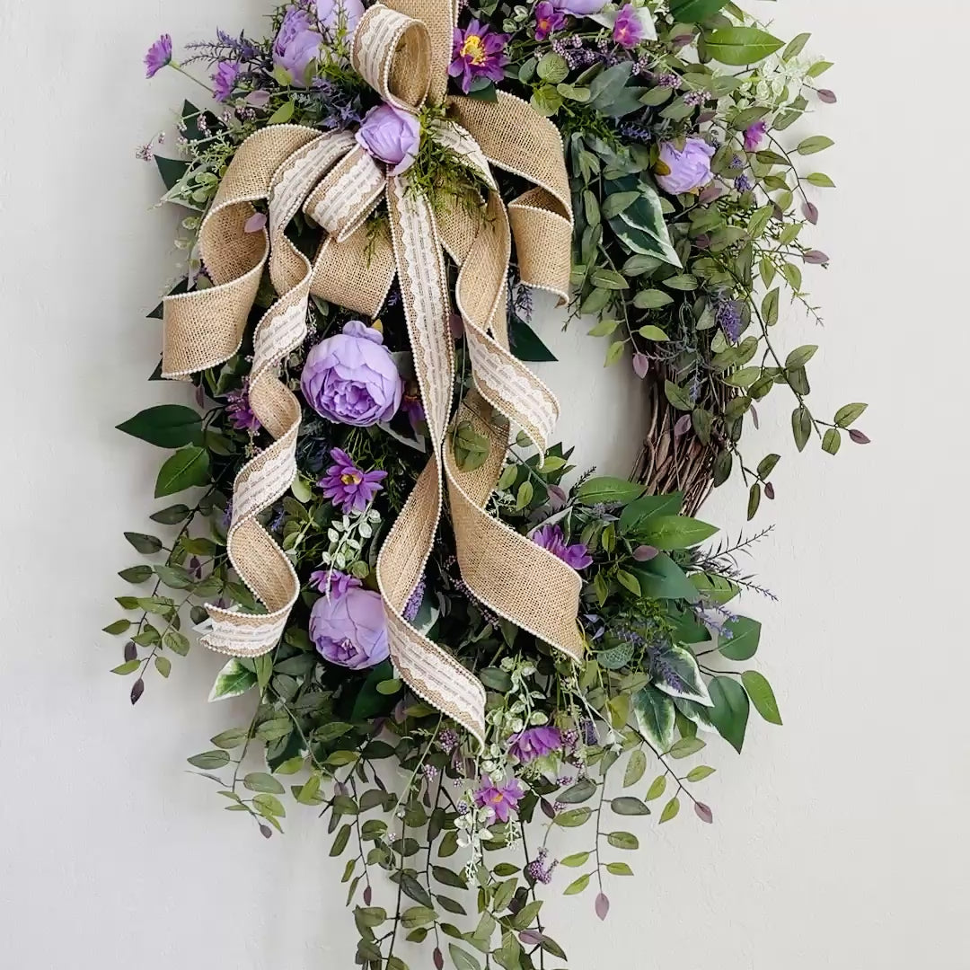 Transform your home with the beauty of this handmade lavender peony wreath, perfect for adding elegance and charm to your entryway, living room, bedroom, or mantel. Crafted on a 14-inch oval grapevine base, this one-of-a-kind wreath offers a lush, cascading design with: