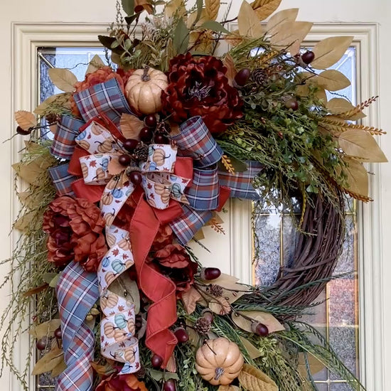 Welcome fall in timeless style with this handcrafted autumn wreath, overflowing with rich textures and cozy charm. Designed on a natural grapevine base, this elegant wreath features cascading greenery, lifelike rust-colored peonies, petite pumpkins, and a beautifully layered fall bow.