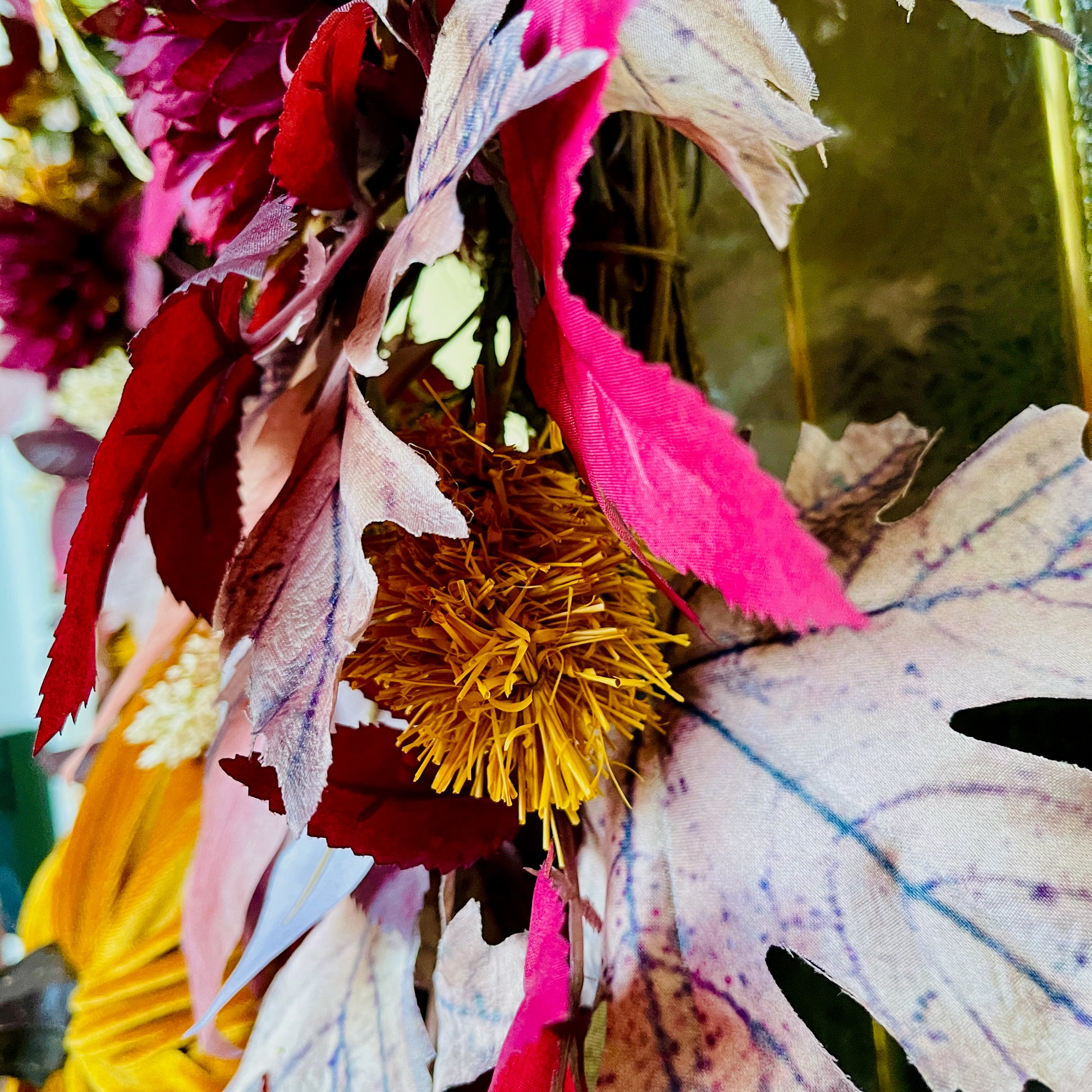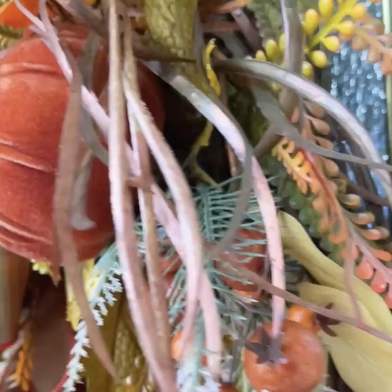 Materials: Velvet pumpkin, silk florals, premium ribbons, grapevine base